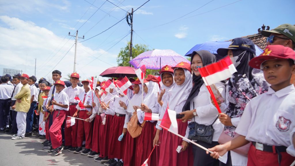 Kunjungan Prabowo di DIY untuk meresmikan Jembatan Kabanaran mendapatkan sambutan dari siswa-siswi setempat. Mereka berdiri di tepi gumuk pasir menyambut kedatangan presiden.